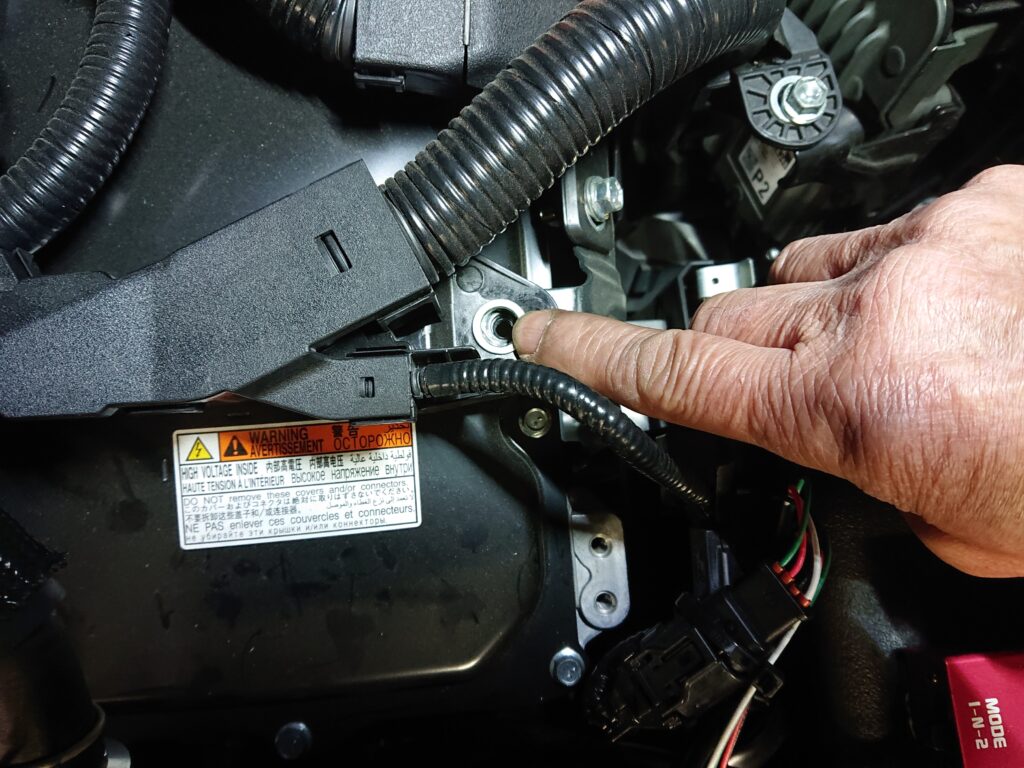 と言うことで穴拡大作業決定。ワイヤーハーネスの束が邪魔して、ドリルが入らないので、取り敢えず少しだけ膝行って貰いました。