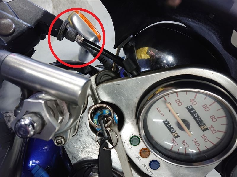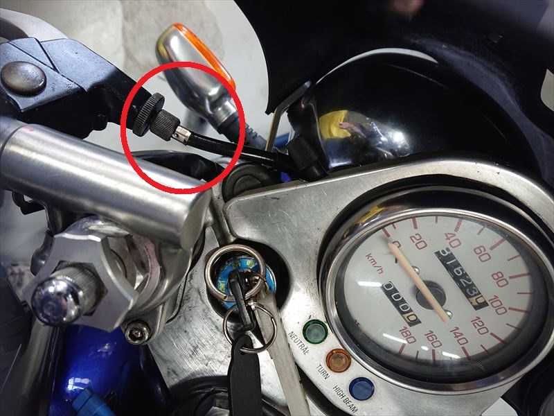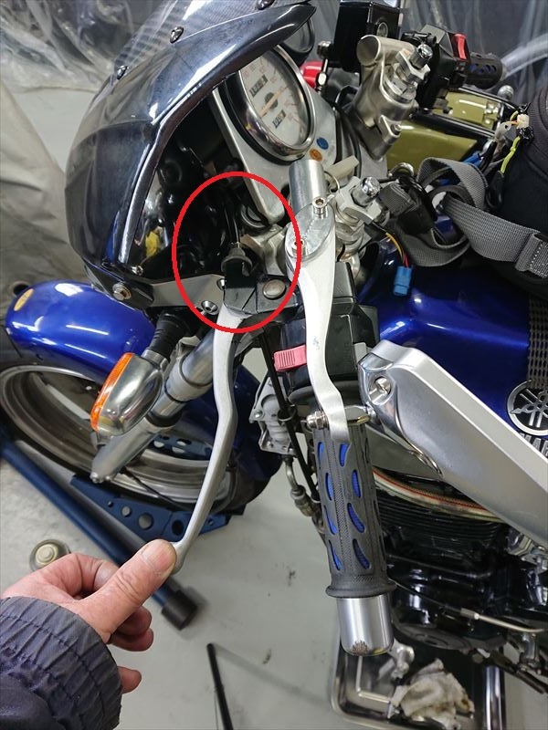一方、レバーを握りやすい位置まで下げると、赤丸の隙間はメーターステーに近づき、フリクションは増えます。