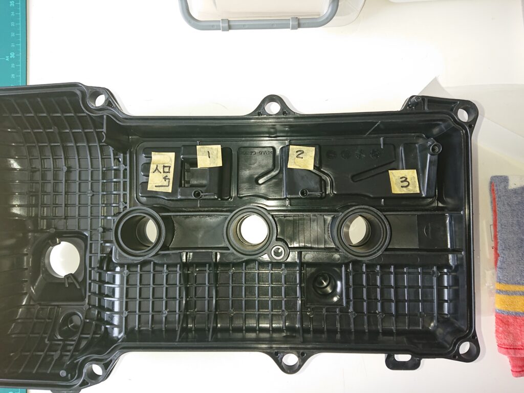 ヘッドカバーを裏から見ると・・・、ガスは入り口から、左側に潜って、①付箋の上下通路を通り、②、③と3つに分けられた部屋(セパレーター)を通って、外部に排出。ん???、部屋が三つもあるのに、どれも機能していない?という疑問が生まれる。ここまで細かく、分けられているなら、③に到達する前に分離は完了していなければならない。 筈ですよね?。
