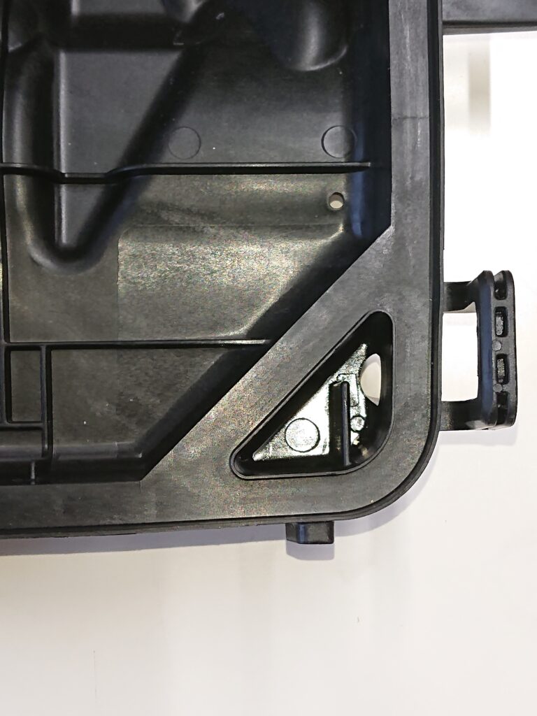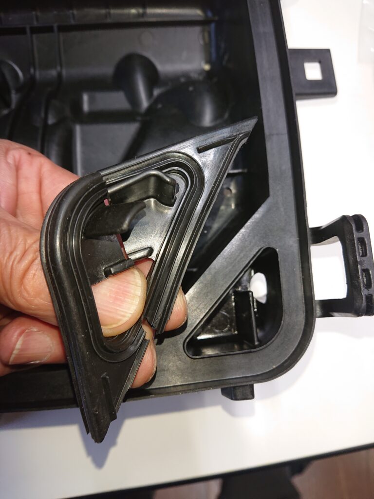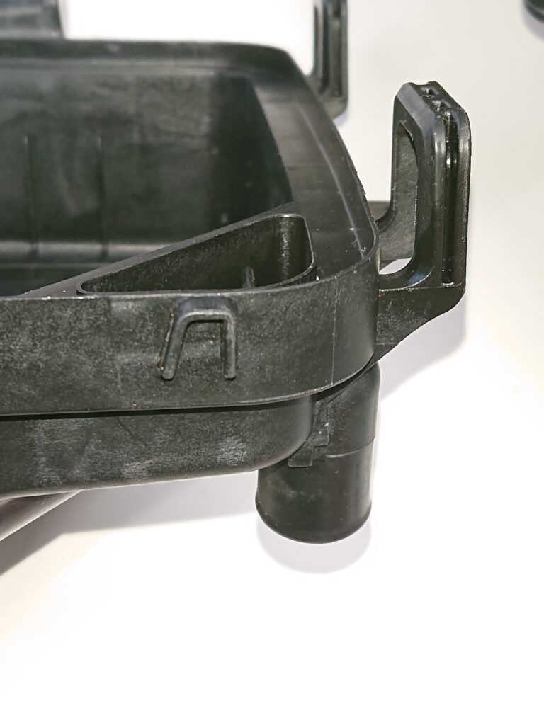 クリーナー・ボックスの内側を上から見たところ。ブローバイ出口は、オフセットされて半分塞がっています。